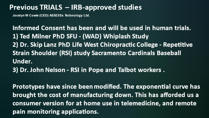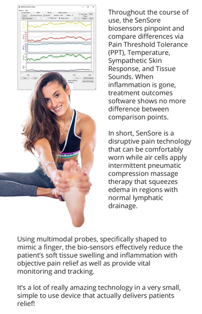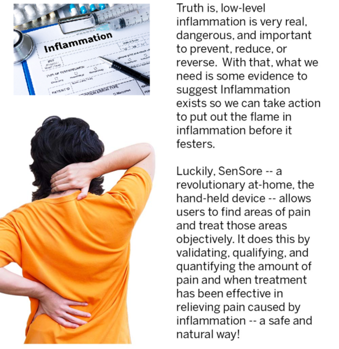 Inflammation is the “Secret killer” known to be the cause of pain and age-related disease. Pain is caused by soft tissue inflammation(s) in acute, sub-acute, and chronic pain conditions. Sen~SORE makes what we feel as pain visible using an Acupoint, Biosensors, for Sen~SORE provide Quantitative and Qualitative Data about inflammation, the root cause of all pain.https://www.youtube.com/embed/UtRXbTfcJB8?autohide=1&controls=1&showinfo=0 https://www.youtube.com/embed/wWM2NF9pHP4?autohide=1&controls=1&showinfo=0