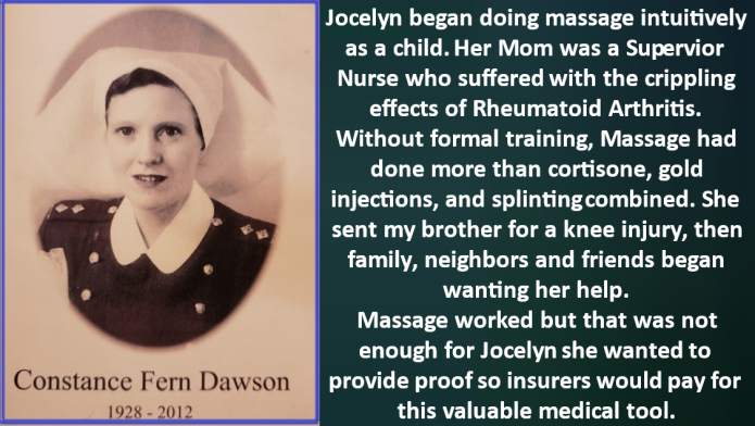 Before modern diagnostic technologies arrived on the scene, early disease detection relied on physicians’ palpation skills. Palpation is the use of their hands to detect soft tissue damage. Jocelyn has researched the cause of pain and how acupressure massage resolves inflammation.