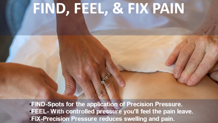 FIND soft tissue inflammation, FEEL pain when Pressure Points are found, and FIX pain by using acupressure massage.